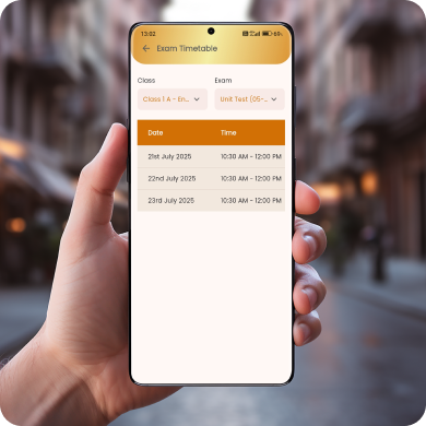 The Exam Timetable feature allows teachers to view and manage exam schedules with complete details of subjects, dates, and time slots, helping them plan assessments, avoid conflicts, and ensure smooth coordination of examinations across classes and sections.